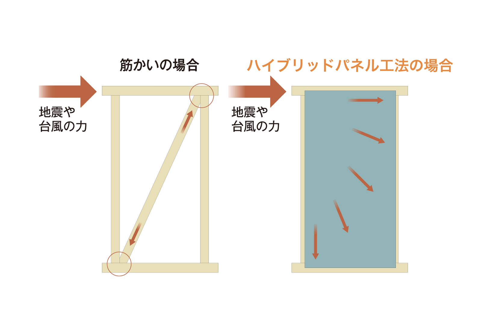 一般的な筋交いによる耐力壁は、地震の際に接合部に力が集中しやすく、そこから損傷や倒壊が起きる可能性があります。一方、ハイブリッドパネル工法で造られた面材耐力壁は、壁面全体で揺れの力を受け止める構造のため、力が一部に集中することなく、家全体でバランスよく地震エネルギーを吸収します。