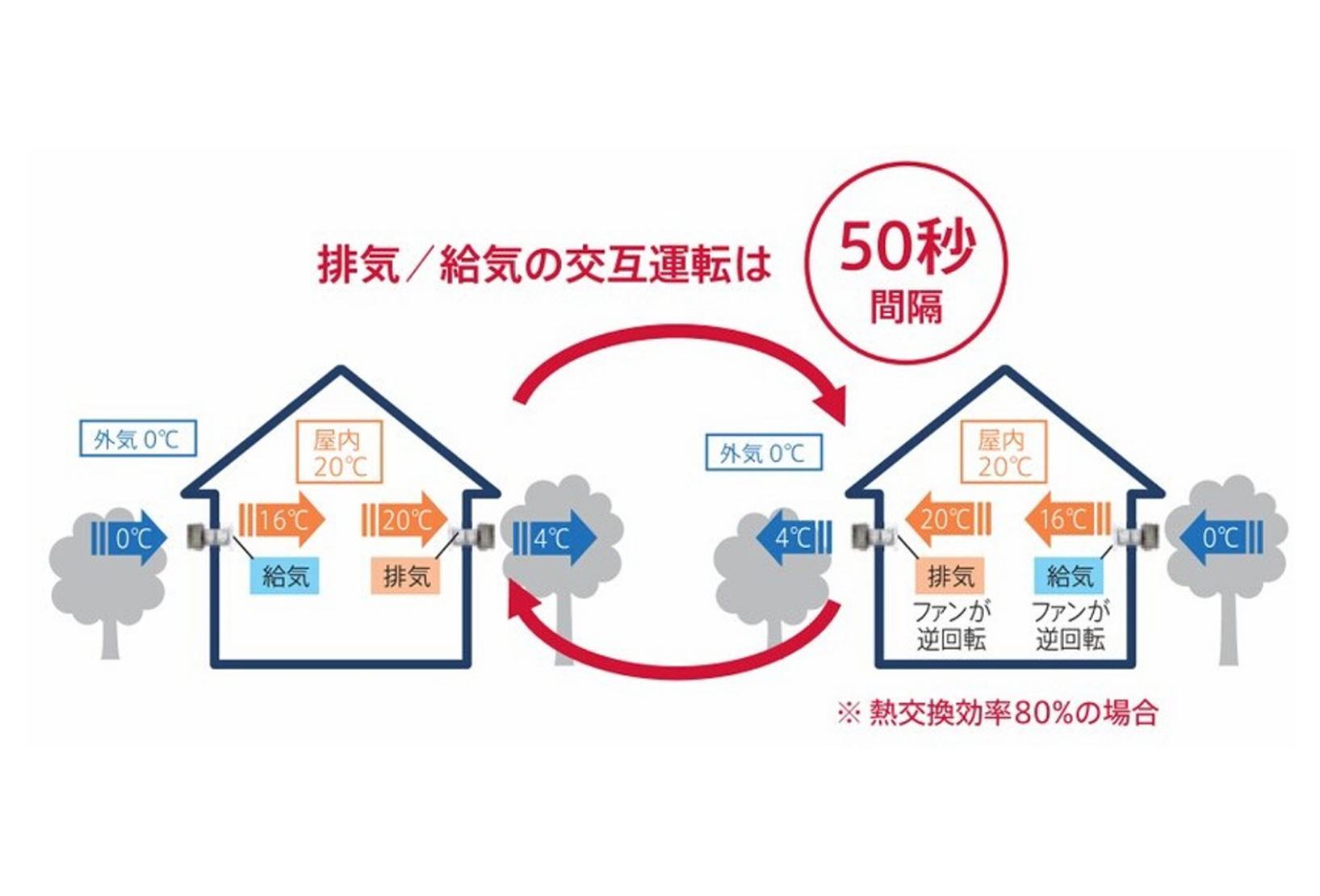 排気時に室内の空気が持つ熱を回収し、その熱を使って外の新鮮な空気をあたためてから室内に取り込む換気方法です。冷暖房中の快適な室内環境を保ちながら換気ができるため、空調のランニングコストが下がり、省エネにもつながります。24時間自動で換気を行うので、常に清潔な空気環境が守られ、ウイルス対策としても効果が期待できます。