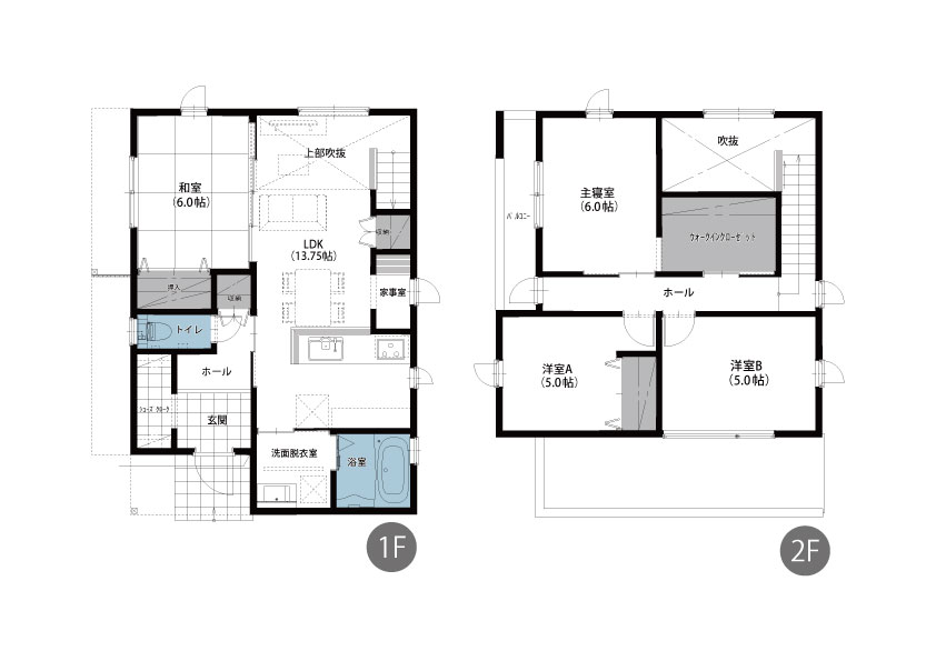 シューズクロークやウォークインクローゼット、和室など、あると便利な設備を設けたプランです。水回りを一か所にまとめた家事ラク動線な間取りになっています。 |