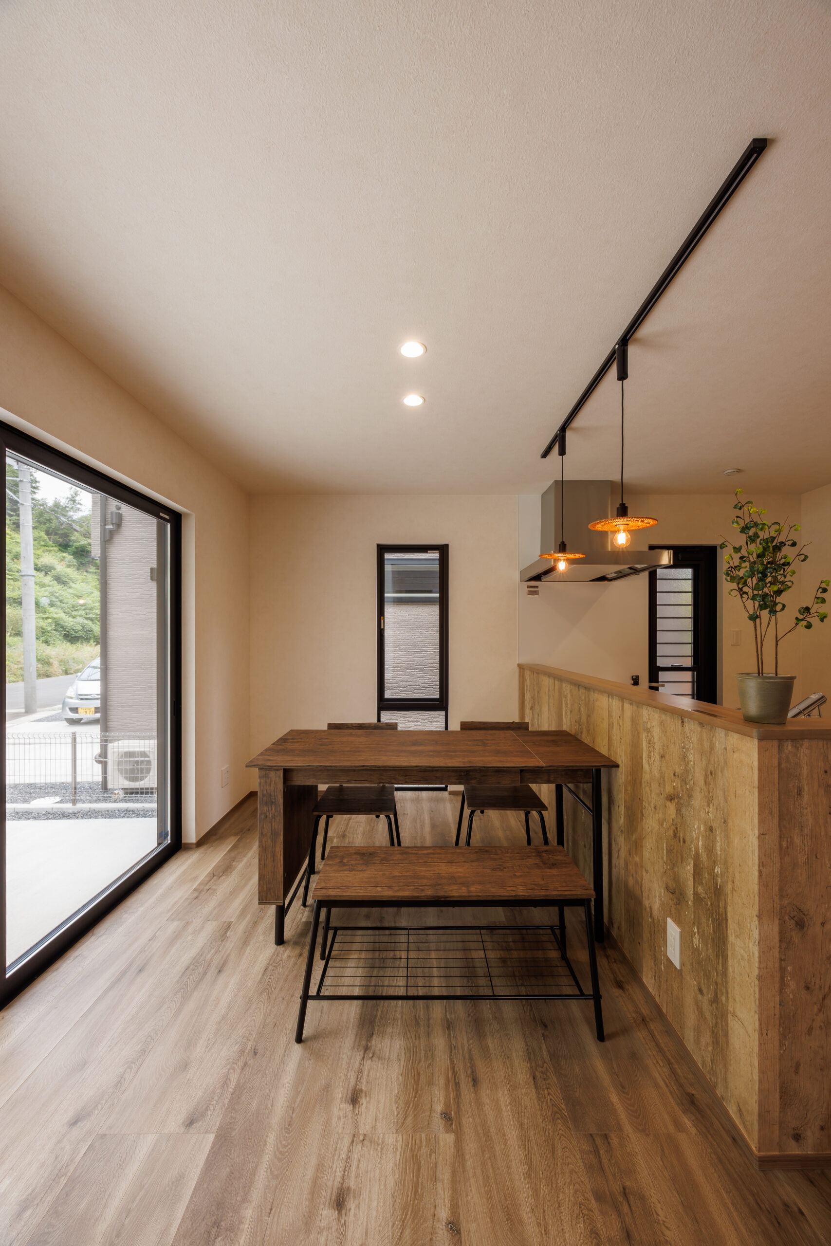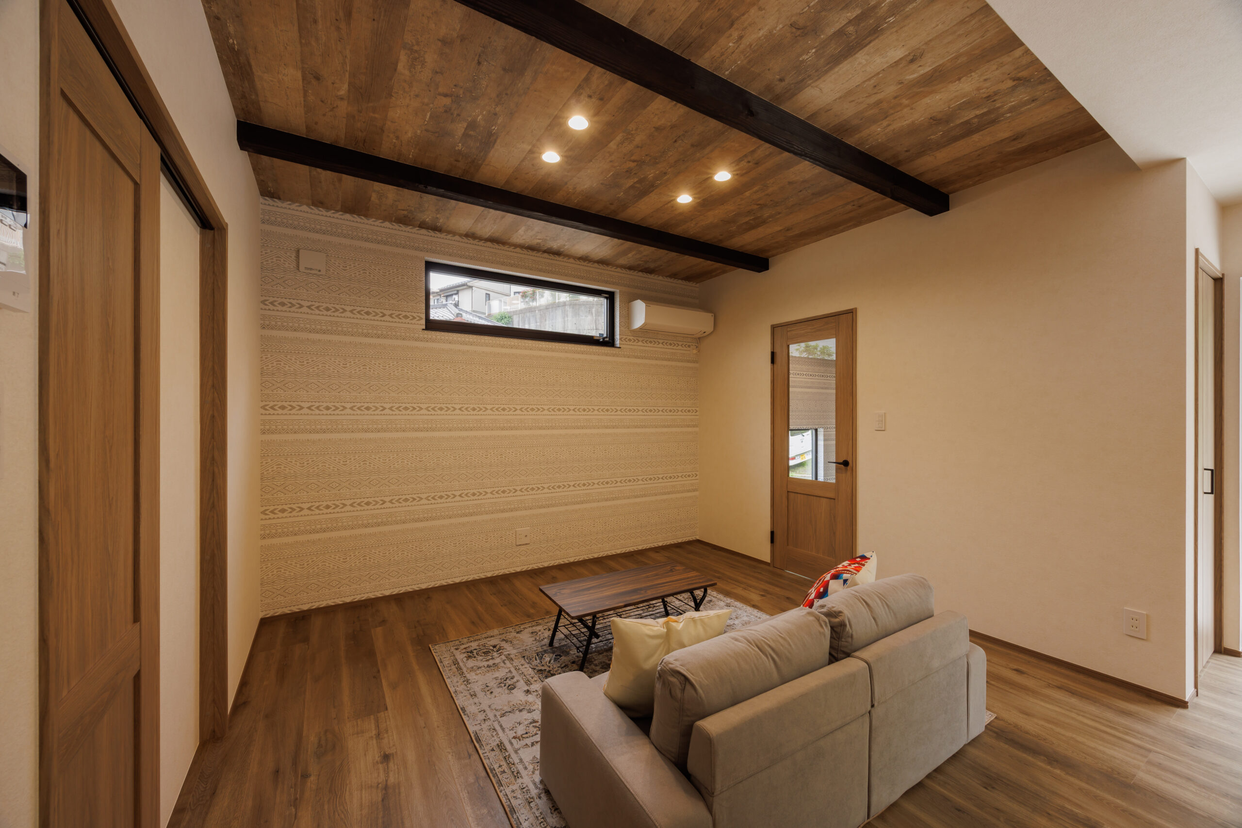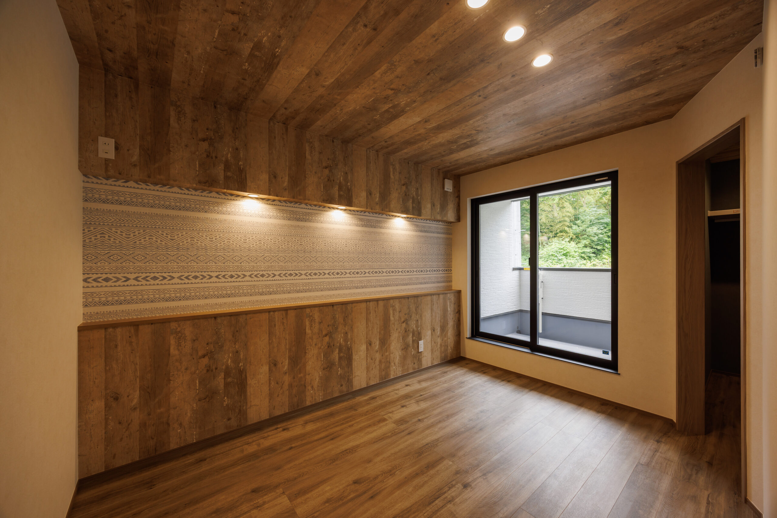 トライバル柄と木目調の壁紙をアクセントに取り入れたエキゾチックな内装のお家。