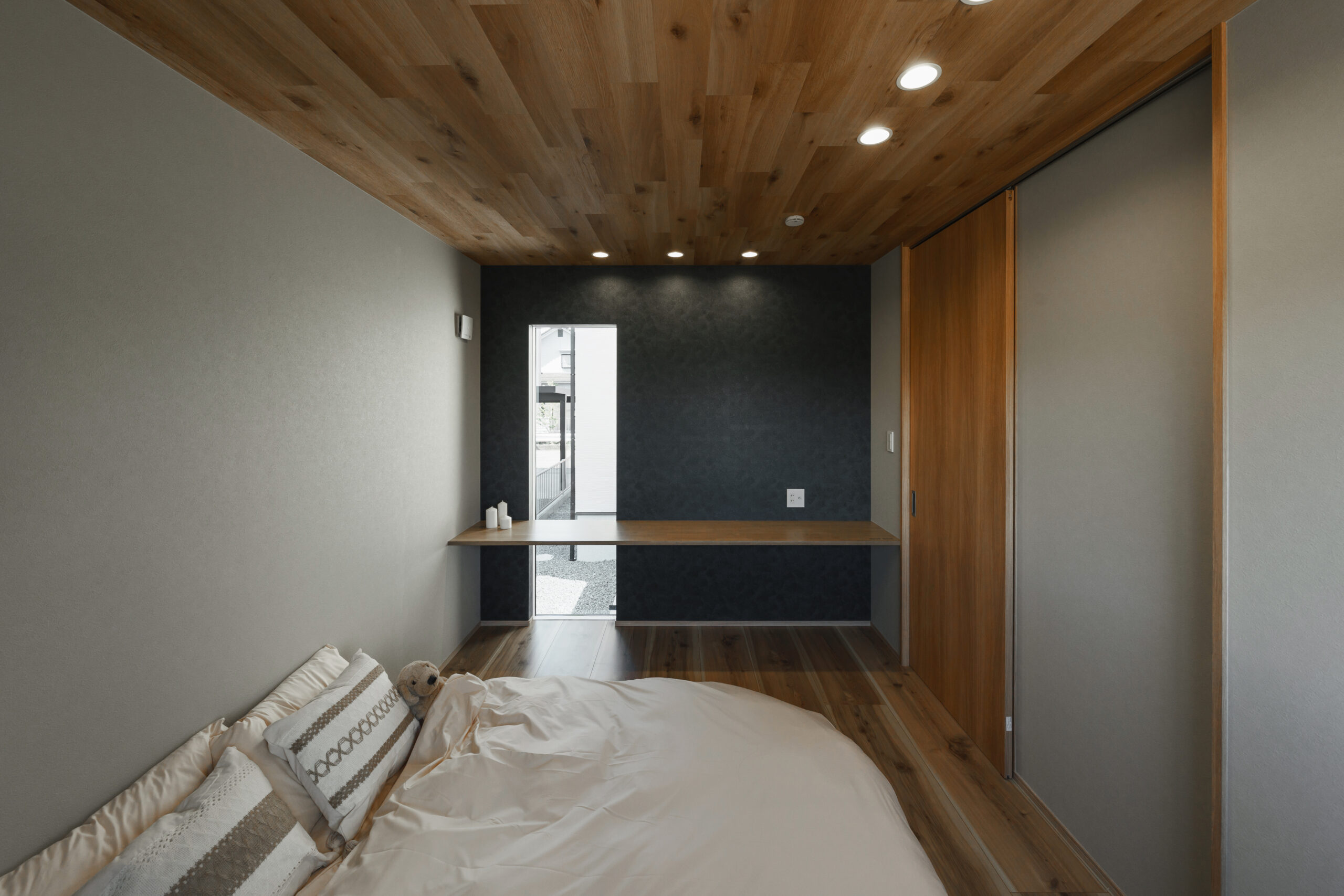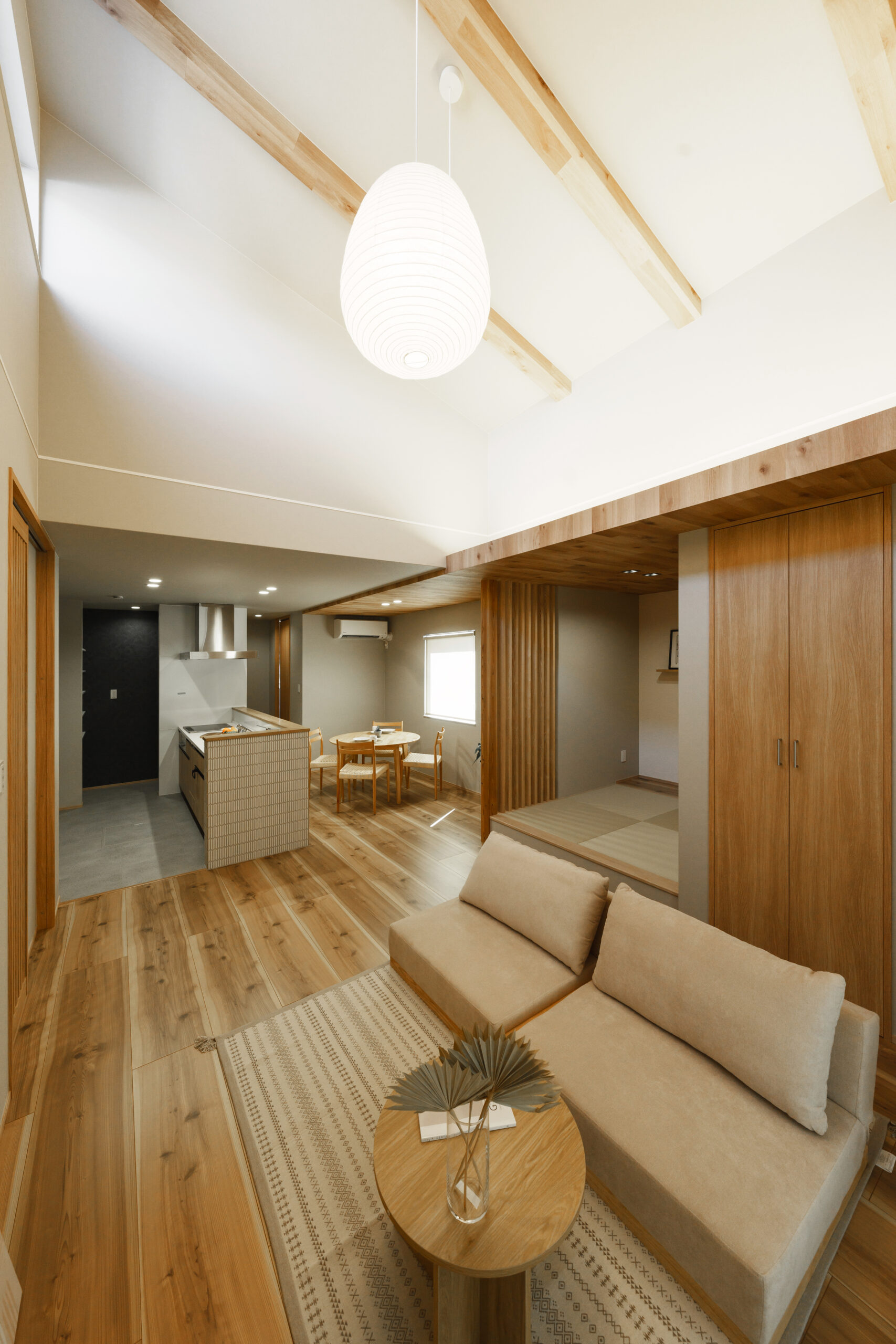 無垢の木の風合いのフローリングに、塗り壁調の壁紙で和モダンに仕上げました。