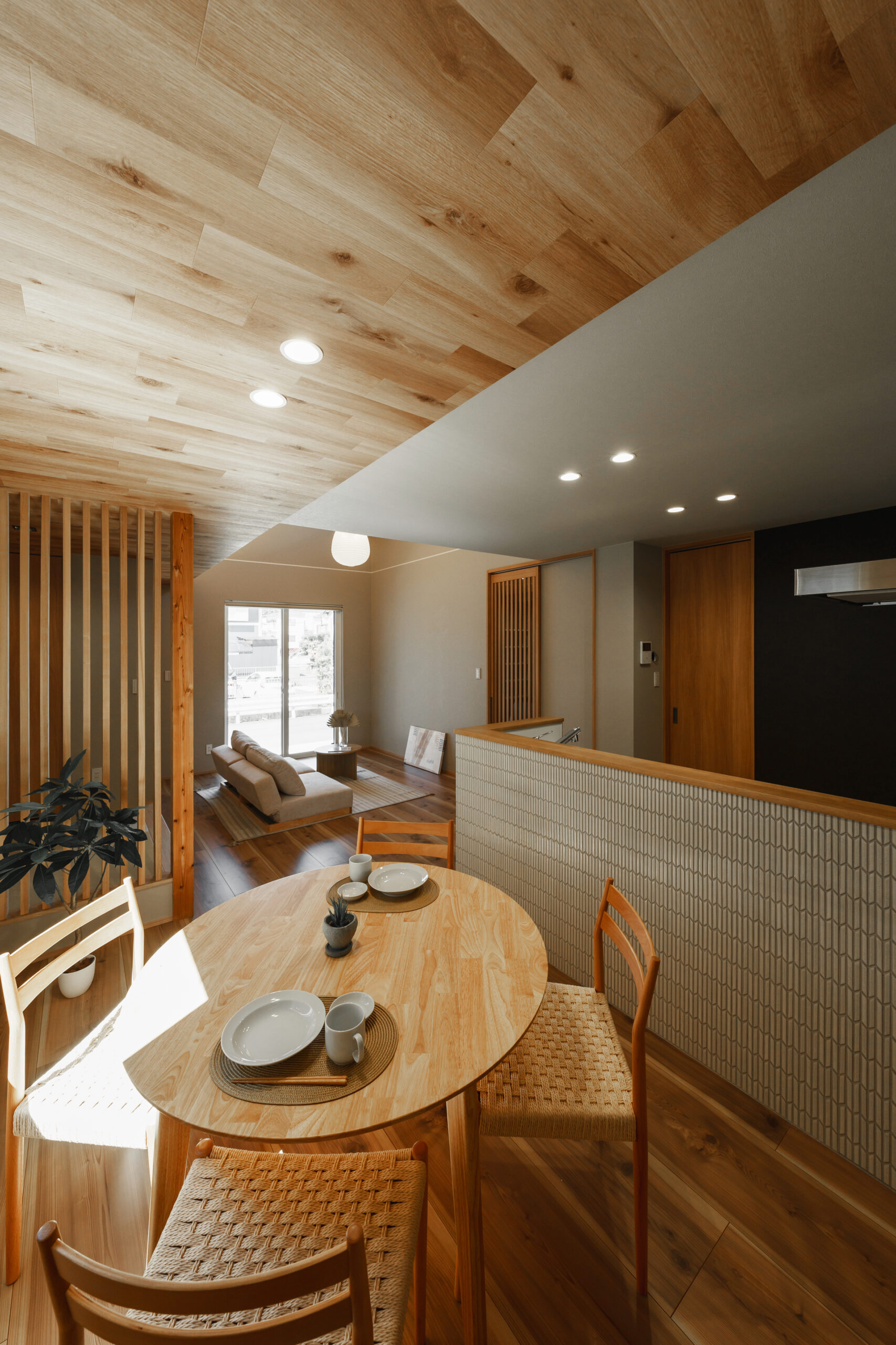 小上がりの畳コーナーには木製格子の間仕切りや、違い棚風の収納を設け、より和のテイストをプラスしました。