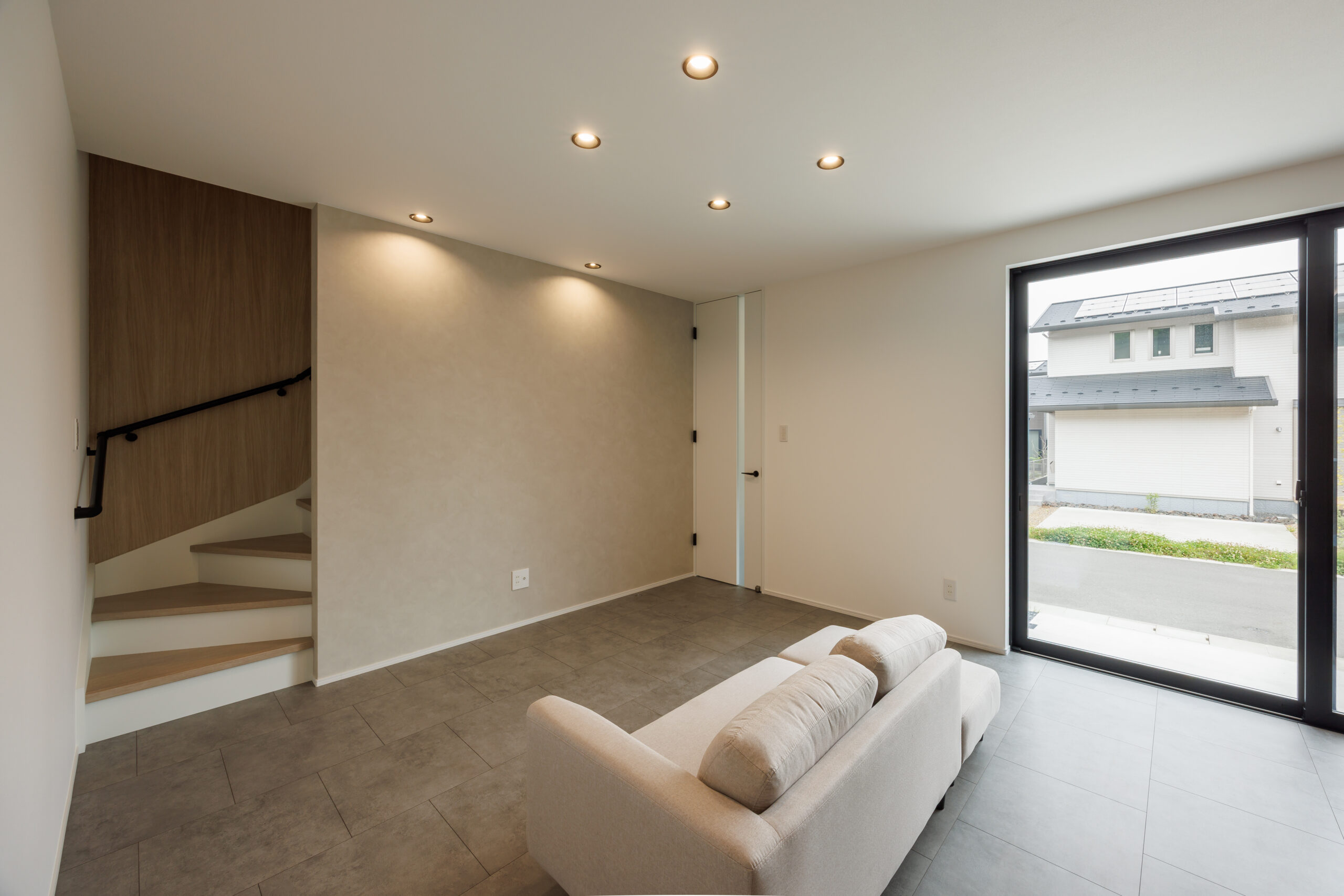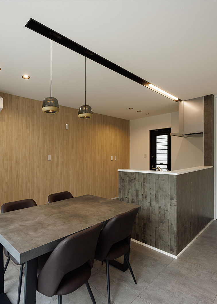 モルタル調のフローリングや、タイルの質感をリアルに再現した壁紙を採用し、ホテルライクな洗練されたお家。