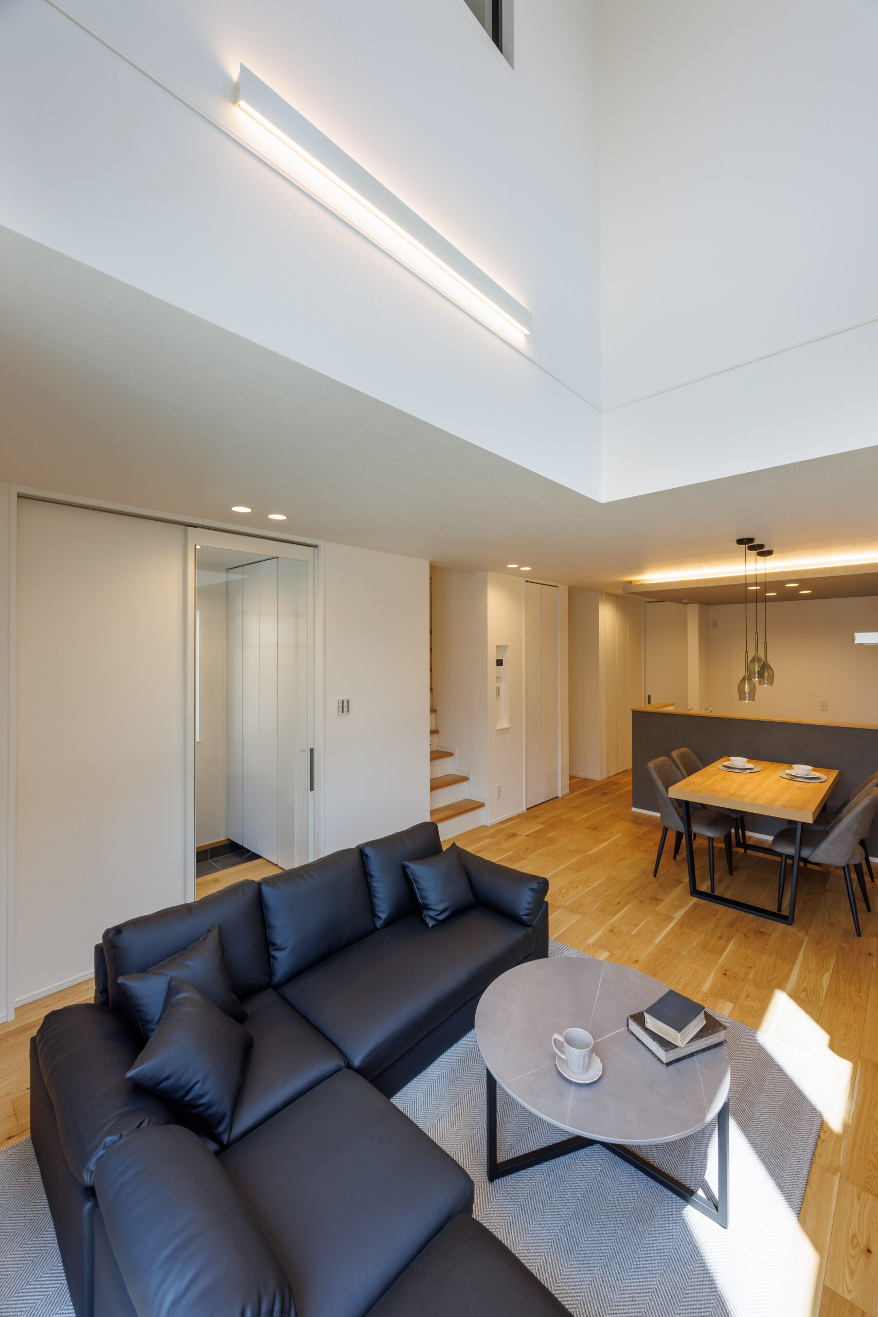 吹抜けから明るい光が差し込む開放感抜群のリビング。