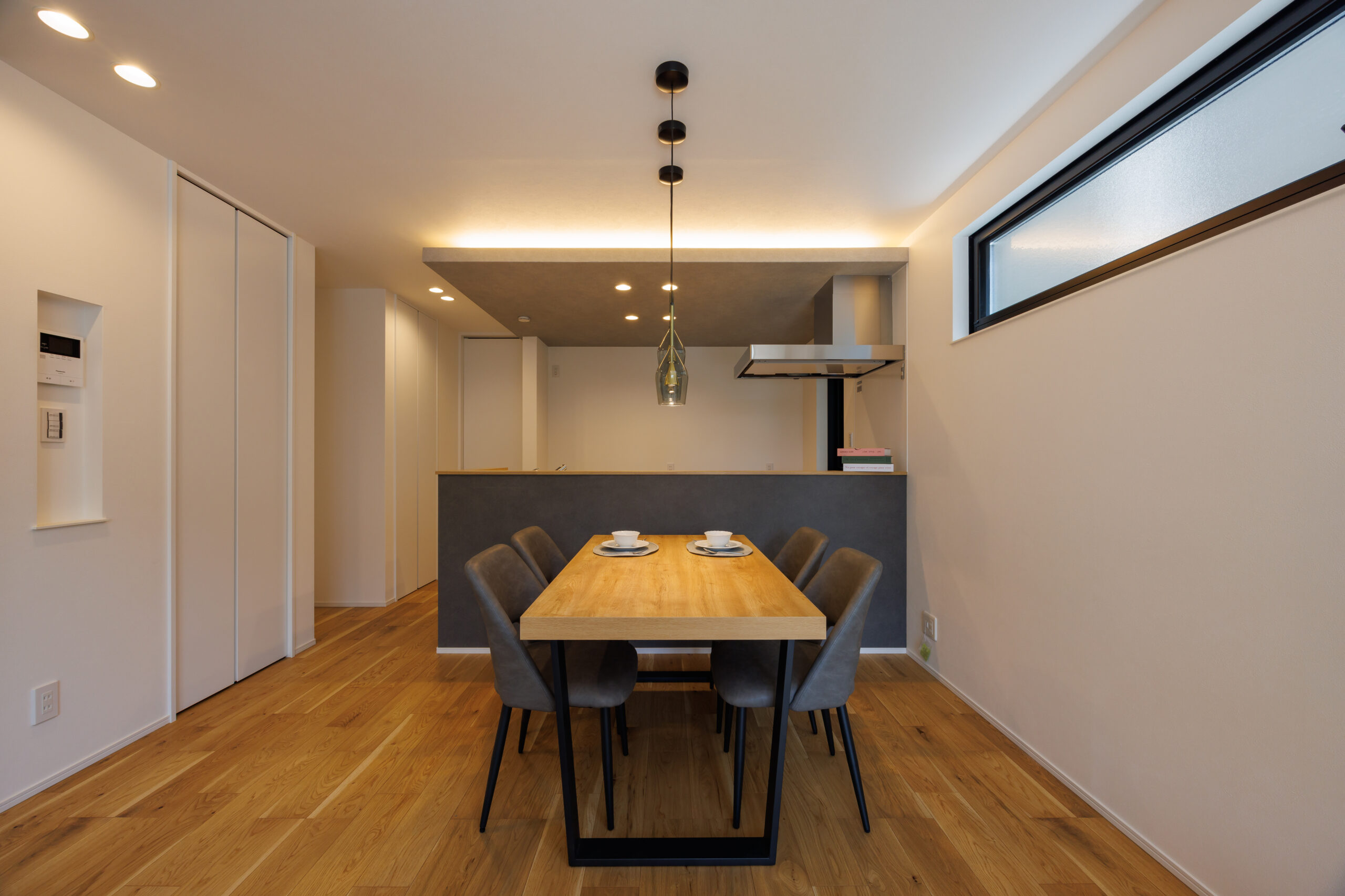 オーク色のフローリングやキッチン上部の間接照明が温かみのある空間を演出してくれます。